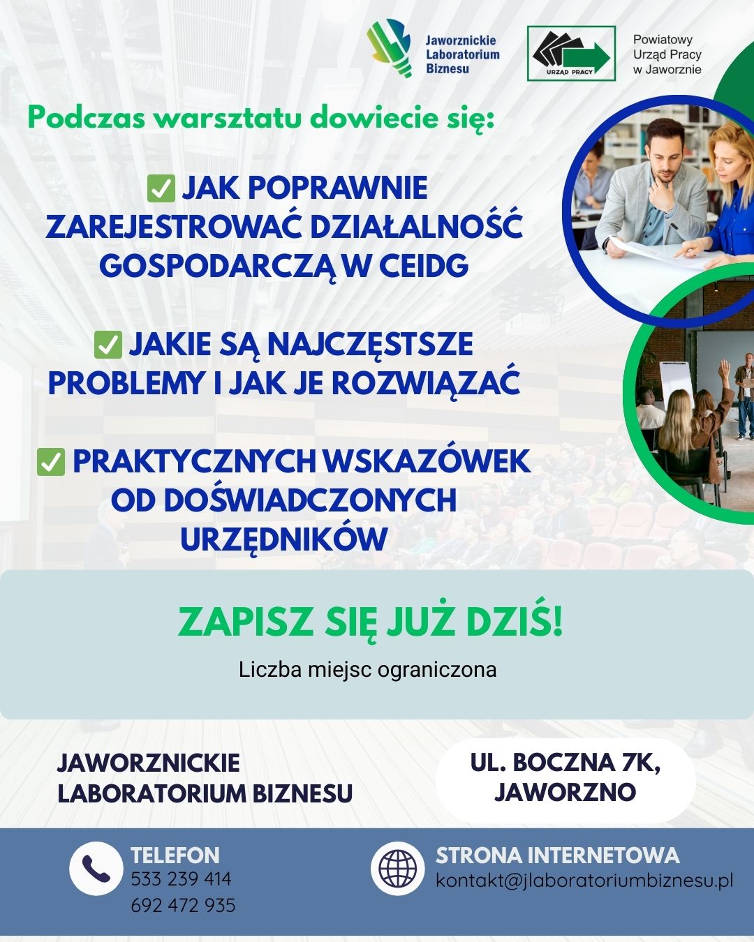To doskonała okazja, aby uzyskać odpowiedzi na wszystkie pytania związane z rozpoczęciem działalności gospodarczej od Ekspertów z Urzędu Miejskiego w Jaworznie.